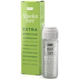 Absolut Torr är en extra effektiv antiperspirant som motverkar svett och dålig lukt i upp till 7 dagar, effektiv mot alla typer av svettningar, t ex armsvett, handsvett och fotsvett. Absolut Torr rekommenderas även vid besvär med överdriven svettning sk hyperhidros. Med Absolut Torr kan du vara dig själv till 100% med 0% oro för svett. Gör så här:
