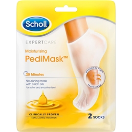 Scholl Moisturising Pedi Mask Triple Oil är en socka som innehåller en blandning av oljor som är intensivt fuktgivande, och som lämnar fötterna mjuka och lena. Sockorna behöver endast sitta på plats under 20 minuter, för att oljorna ska hinna tränga in i huden. Oljeblandningen består av arganolja, jojobaolja och avocadoolja.