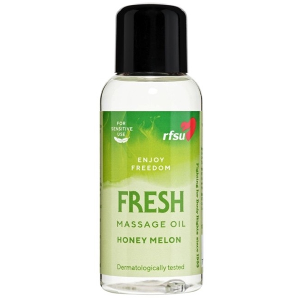 RFSU MASSAGEOLJA FRESH är en massageprodukt med lätt doft av honungsmelon. Innehåller mandel och jojobaolja, som ger en mjuk känsla och verkar välgörande för huden. Oljan är avsedd för utvärtes bruk och behöver ej sköljas av. Dermatologiskt testad.Massageoljan är inget glidmedel och rekommenderas inte att användas tillsammans med/på latexkondomer.