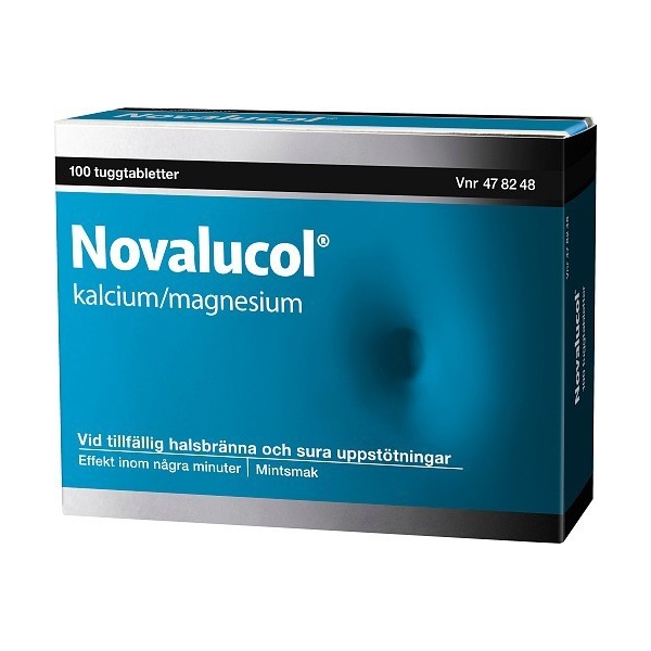 Obs! 18-årsgräns på receptfria läkemedel!Novalucol används vid tillfällig halsbränna och sura uppstötningar. Novalucol binder saltsyran i magen och minskar därigenom surheten i den.
