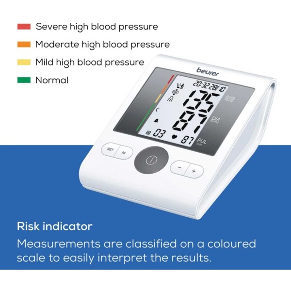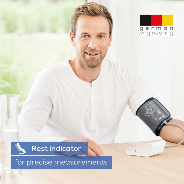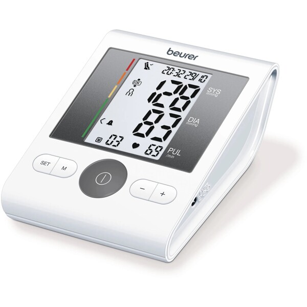 Helautomatisk blodtrycksmätning för överarm. Visar systoliskt och diastoliskt tryck samt puls. Lätt att använda. Tydlig display. Snabb och bekväm mätning. Kliniskt testad enligt ESH. Riskindikator. Upptäcker arytmi: Varnar vid eventuell oregelbunden hjärtrytm. Universalmanschett för överarmmed omkrets 22-42 cm. 4 x 30 minnesplatser. Visar genomsnittligt blodtrycksvärde av samtliga sparade blodtrycksresultat. Automatisk avstängningsfunktion. Signal vid felmeddelande. Batteriindikator.Kan användas med nätadapter (Beurer). Förvaringsväska och 4 x 1,5V alkaliska batterier AA ingår.