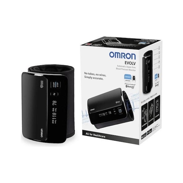 Omron EVOLV är Omrons mest exklusiva blodtrycksmätare. Det är en slanglös mätare som mäter blodtrycket snabbt, enkelt och säkert. Intelli Wrapmanschett ger extra säker mätning då den mäter runt hela armen (360˚), och har en indikator som markerar om manschetten inte sitter korrekt. Evolv blodtrycksmätareindikerar vid oregelbundna hjärtslag och kroppsrörelser under mätningen.Den har en minnesfunktionen som lagrar de 100 senaste resultaten i tid och datum och visar ett genomsnitt av de tre senaste resultaten i appen. Kliniskt validerad och godkänd för gravida och diabetiker.
