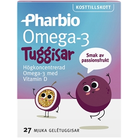 Pharbio Omega-3 Tuggisar har en god smak av passionsfrukt och är lätta att tugga. De innehåller högkoncentrerad omega-3 och vitamin D, ämnen som är viktiga för barns utveckling. Tuggtabletterna innehåller även en hög nivå av DHA som bidrar till den normala utvecklingen av barns hjärna och syn. Omega-3 tuggisarna innehåller dessutom vitamin D.