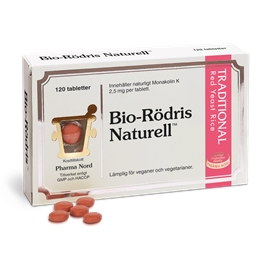 Fermenterat rödris med naturligt monakolin K. Fermenterat rödris innehåller ett ämne som heter monakolin K. Bio-Rödris Naturell innehåller 2,5 mg monakolin K per tablett.