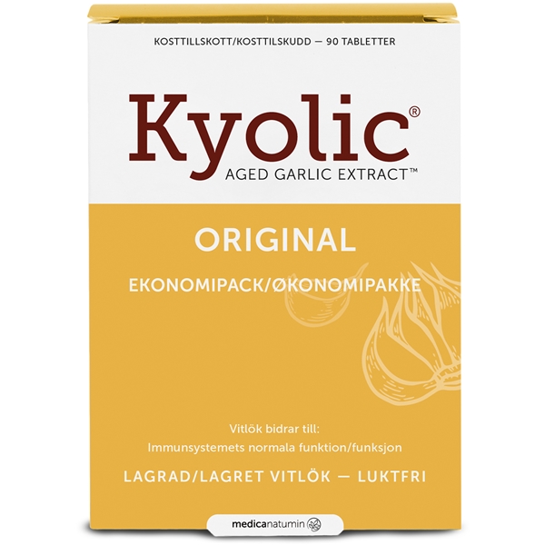 Kyolic Aged Garlic Extract (AGE™) Original innehåller ett kallextraherat vitlöksextrakt från Californien, som lagrats i 18-20 månader på stålfat. Den särskilda framställningsmetoden eliminerar illaluktande och fettlösliga svavelämnen, vilket resulterar i ett luktfritt extrakt som kan konsumeras utan att orsaka kroppsdoft. Tillverkningsmetoden gör dessutom att Kyolic Aged Garlic Extract är skonsam för magen.