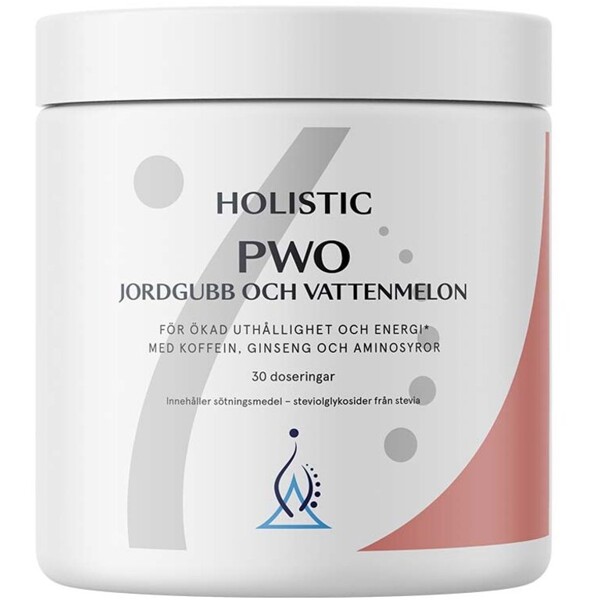 Holistic PWO är vegansk och baserad på ingredienser med högsta kvalitet som sammanställts i Sverige. Produkten har en god och uppfriskande smak av jordgubb och vattenmelon - sötad med steviolglykosider från stevia.