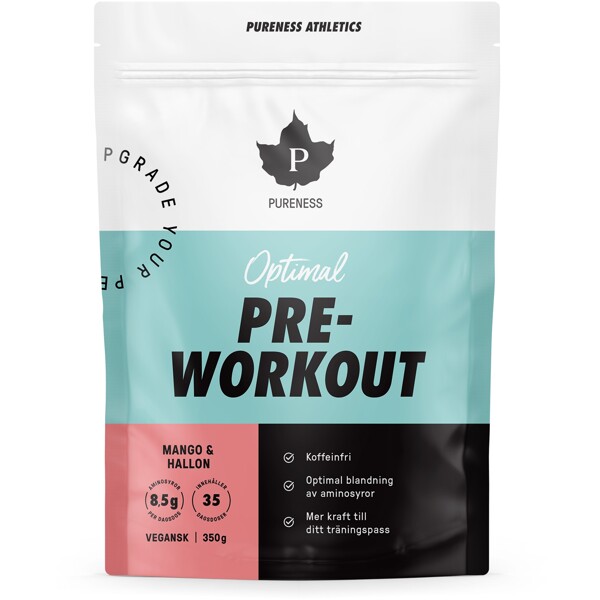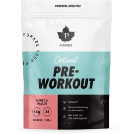 Fullt fokus och boost för dina träningspass! Syftet med att dricka PWO före träningen är att ge effekt och hjälpa dig att prestera bättre. Pureness Optimal Pre-workout -pulver med smak av mango och hallon är en ren och högkvalitativ träningsladdare tillverkad utan kompromisser på vare sig kvalitet eller smak. Optimal Pre-Workout Mango & Hallon innehåller ett optimalt förhållande av aminosyror. De grenade aminosyrorna i produkten kan hjälpa kroppen att främja muskelåterhämtning och tillväxt. Den fräscha smaken av mango och hallon kommer från naturliga aromer.Fri från socker, aspartam, sukralos eller acesulfam K - inga konstgjorda smak- eller färgämnen! Optimal Pre-Workout innehåller inget extra, bara rena och nödvändiga ingredienser för att din kropp ska öka sin prestanda och effektivitet. Vegansk produkt.