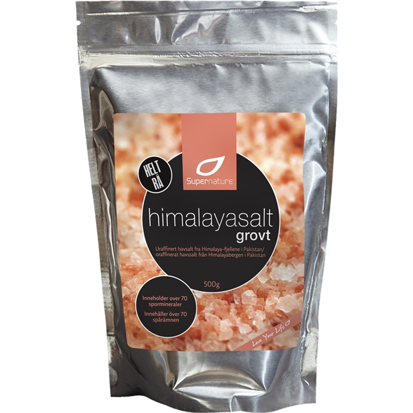 Oraffinerat grovt havssalt från Himalaya i Pakistan. Innehåller över 70 naturliga spårämnen. Salt består till 97-98% av natriumklorid. Därutöver innehåller Supernatures himalayasalt över 70 naturliga spårämnen.Viktigt att veta!Kan innehålla spår av nötter.