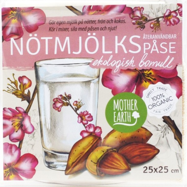 Nötmjölkspåse i ekologisk bomull, 25 x 25 cm. Denna nötmjölkspåse, eller silpåse, är perfekt för att göra mjölk av nötter och frön. Mandelmjölk är en klassiker som passar i smoothies för extra krämighet, till frukostgröten, eller varför inte i kaffet? Hur tjock eller fet mjölken ska vara bestämmer du själv genom mängden vatten. Kör i mixer tills råvaran blivit riktigt finfördelad, sila sedan genom påsen, och pressa ur för att få ut maximalt med mjölk. Man kan också använda påsen till att göra ost, som får hänga och rinna av i påsen, eller till att sila juice som ska vara helt slät. Kom dock ihåg att juice kan göra påsen missfärgad.Påsen tvättas i rinnande varmt vatten.Obs! Glöm inte att spara nötresterna till roliga kakor, pizza-bottnar, matbröd eller råcrackers.