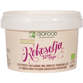 Kokosolja från färska kokosnötter från ekologiska odlingar. Kokosnötråvaran, den så kallade kopran, torkas och kallpressas. Det är endast oljan från den allra första pressningen som används för att få bästa kvalitet och för att bevara den fantastiska smaken och doften av kokos. Använd kokosolja i matlagning, stekning och till ugnsrostning,. Det kan också användas till hemgjort godis och bakning, som pajdeg och grovt bröd.