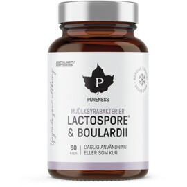 Pureness mjölksyrabakterier med boulardiijäst är en effektiv kombination för bra matsmältning och god tarmflora.LactoSpore® är en så kallad sporformad mjölksyrabakterie. Det gör den starkare än de flesta vanliga mjölksyrebakteriestammarna. Sporformen gör också att den är motståndskraftig mot magsyran och kan lättare tas upp av kroppen. Lynside® boulardii är en probiotisk jäst av en noggrant forskad och patenterad stam.Både LactoSpore® och Lynside® boulardii klarar den tuffa miljön med magsyra och enzymer, så de kan göra nytta där de behövs. De aktiva ämnena absorberas snabbt i kroppen och ger effekt inom kort.Kapseln är utformad med fördröjd upplösning, vilket gör att den inte löses upp förens den når tarmen. På så sätt överlever en större mängd bakterier. Ta gärna mjölksyrabakterier om magen är i obalans, om du äter antibiotika eller innan och under en utlandsresa.