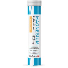 BioSalma magnesium brus är brustabletter med 187,5 mg magnesium per tablett och smak av apelsin.
