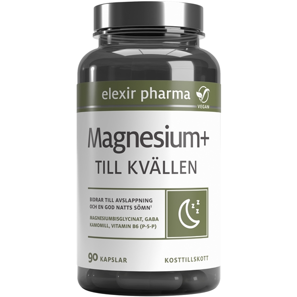 Magnesium+ Till kvällen från Elexir Pharma består av magnesiumbisglycinat tillsammans med vitamin B6 i den aktiva formen P-5-P (pyridoxal-5-fosfat), GABA och kamomillextrakt.