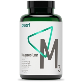 Magnesium är nödvändigt för normal muskelfunktion och spelar en central roll i konverteringen av kolhydrater till energi men utsöndras samtidigt av musklerna vid träning. Puori M3 kombinerar organiska former av de 2 oumbärliga mineralerna magnesium och zink. Magnesium är den fjärde mest förekommande mineralen i kroppen, och deltar i mer än 300 enzymatiska processer och är av avgörande betydelse för god hälsa. Zink är ett viktigt mineral som medverkar i många delar i metabolismen, och för ett normalt immunförsvar. M3 innehåller även vitamin B6 som bidrar till att minska trötthet och utmattning.Vissa mikronäringsämnen, särskilt kalcium, kan störa absorptionen av magnesium. Undvik att ta magnesium tillsammans med livsmedel rika på kalcium såsom mejeriprodukter. Alkohol har också visat sig minska upptaget av magnesium. Bästa tiden att ta magnesium är 30 minuter före sänggående eller efter ett träningspass på fastande mage.Företaget grundades i Danmark 2009 och bytte 2017 varumärke från Pure Pharma till Puori. De har som mål att producera renast möjliga naturliga produkter som är vetenskapligt testade, för att förbättra hälsa och fysisk prestation.