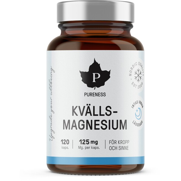 Pureness Kvällsmagnesium är ett kosttillskott med magnesium och örtextrakt som är framtaget för att bidra till bättre sömn och avslappning! Perfekt för dig som kanske känner dig stressad eller har sömnproblem.Magnesiumformen är magnesiumbisglycinat, en magnesiumform som kännetecknas av att vara mycket magvänlig, ha hög absorptionsförmåga samt ha en lugnande effekt då aminosyran glycin, som är bunden till magnesiumet, agerar som en lugnande signalsubstans i kroppen. Tillskottet av L-teanin i Pureness Kvällsmagnesium förstärker den naturliga dygnsrytmen och kan även påverka hjärnvågorna under djupsömn vilket kan leda till färre uppvaknanden under natten. Innehåller även kamomillblomma som är en välkänd ört som lugnar det centrala nervsystemet och främjar sömnen - perfekt för dig som vill sova gott!