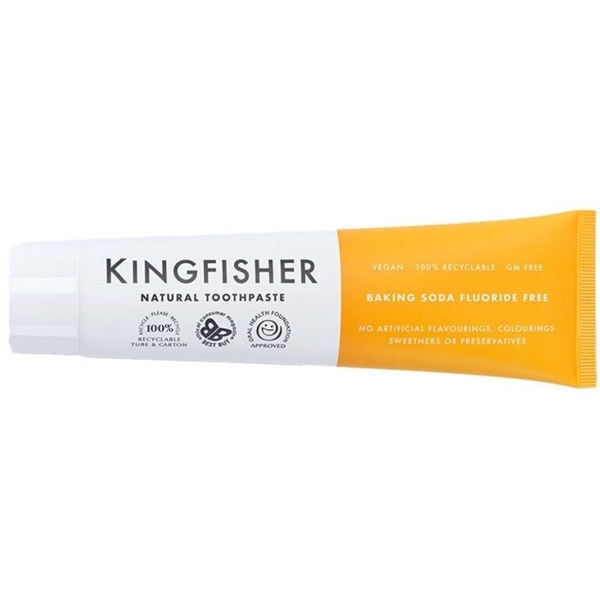 Tandkräm Kingfisher Baking Soda Mint är en tandkräm från Kingfisher med en whitening-effekt från baksodan.Kingfisher är en naturlig tandkräm som inte innehåller färgämnen, aromämnen, sötningsmedel eller konserveringsämnen. Kingfishers tandkrämer är ej testade på djur och innehåller inga animaliska produkter. Dessutom är de fria från genmodifierade råvaror och godkända av British Dental Health Foundation!