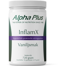 Alpha Plus InflamX är en proteinrik näringsdryck som kan användas som mellanmål och passar utmärkt att blanda i en smoothie eller annan valfri dryck. InflamX är baserat på ris- och ärtprotein och innehåller väl utvalda vitaminer, mineraler och aminosyror samt växtnäringsämnen som ingefära-, gurkmeja- och humleextrakt.