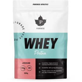 Pureness Whey Protein Jordgubb är ett proteinpulver med jordgubbssmak tillverkad av högkvalitativt vassleproteinkoncentrat.För oss är det viktigt med råvaror av högsta kvalitet. I vårt vassleprotein använder vi mjölk som kommer från fritt betande kor. Ur mjölken ultrafiltreras ett proteinkoncentrat som vi smaksätter. Den härliga smaken av jordgubb kommer från äkta jordgubbspulver och naturliga aromer.Hela kedjan från råvara till färdig produkt kontrolleras noga för att skapa ett proteinpulver utan kompromisser på varken smak eller kvalitet.Pulvret är enkelt att använda. Blanda pulvret med vatten, ditt val av mjölk eller tillsätt det i en smoothie före/efter träning, eller när som helst under dagen för ett nyttigt, proteinrikt mellanmål.Pureness Whey Protein Jordgubb är ett tillskott för att möta det dagliga behovet av protein. Protein bidrar till att öka och bibehålla muskelmassa samt bibehålla normal benstomme.Innehåller inget socker, aspartam, sukralos eller acesulfam K - inga konstgjorda smakämnen, konserveringsmedel eller färgämnen.