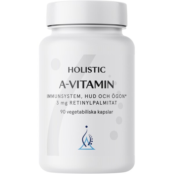 Främjar hud och slemhinnor – kroppens första skyddsbarriär Stödjer immunsystemet Viktig för ögonen och synförmågan Lättupptaglig formulering - utan onödiga tillsatser Holistic A-vitamin innehåller retinylpalmitat, en aktiv och lättupptaglig form av A-vitamin som kroppen direkt kan använda. Denna fettlösliga form är densamma som kroppen naturligt lagrar, framför allt i levern – vårt eget näringsförråd. Kapslarna är omsorgsfullt formulerade med kokosoljepulver för att kroppen ska kunna ta upp vitaminet på bästa sätt. EN NÄRINGSHJÄLTE MED LÅNG HISTORIA Redan i forntida Egypten visste man att lever – rikt på A-vitamin – kunde förbättra mörkerseendet. Idag vet vi att A-vitamin är nödvändigt för bildningen av rhodopsin, ett ämne i ögats näthinna som gör det möjligt att se i svagt ljus. A-vitamin är också avgörande för att kroppens barriärer ska fungera – vår hud och slemhinnor i luftvägar och mage utgör den första försvarslinjen mot bakterier och virus. Vitaminet stödjer uppbyggnaden och förnyelsen av epitelvävnad, vilket hjälper hud och slemhinnor att hålla sig starka, elastiska och motståndskraftiga. Det bidrar dessutom till att slemhinnorna kan producera det skyddande sekret som fångar upp och avlägsnar främmande partiklar. VARFÖR A-VITAMIN? Hjälper till att bibehålla normal hud och slemhinnor Stödjer immunsystemet Bidrar till att bevara synförmågan Stödjer kroppens järnomsättning Viktig för cellernas utveckling och specialisering Produkten är 100% veganvänlig och innehåller inga onödiga tillsatser. Holistics burkar är gjorda av 96 procent biobaserad plast.