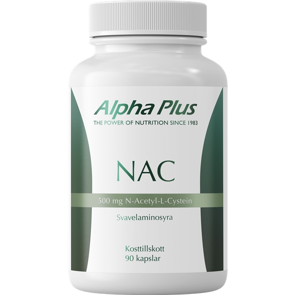 Alpha Plus NAC 90 kap innehåller 500 mg N-Acetyl-L-Cystein som består av svavelaminosyran cystein. Cystein är en central byggsten i det kroppsegna ämnet glutation.