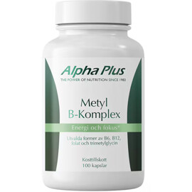 Alpha Plus Metyl-B-Komplex är ett kosttillskott med samtliga B-vitaminer, inklusive de aktiva formerna av vitamin B6 (pyridoxal-5-fosfat), vitamin B12 (metylkobalamin) och folsyra (metylfolat). Produkten innehåller även kolin och trimetylglycin (TMG), även känt som betain. Tiamin, riboflavin, niacin, vitamin B6 och vitamin B12 bidrar till normal energiomsättning och nervsystemets normala funktion. Tiamin, niacin, vitamin B6, vitamin B12 och folat stödjer även normal psykologisk funktion. Riboflavin, niacin, vitamin B6, vitamin B12 och folat bidrar till att minska trötthet och utmattning.