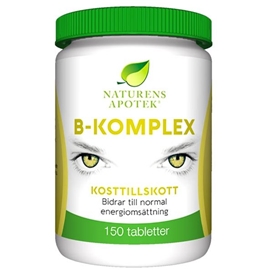 B-komplex innehåller alla olika B-vitaminer. B-vitaminerna bidrar till nervsystemets normala funktion och minska trötthet och utmattning.