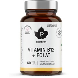 Pureness Vitamin B12 + Folat är en sugtablett med smak av hallon som innehåller aktiva former av vitamin B12. Vitaminen har ett flertal hälsofördelar, bland annat bidrar vitamin B12 till normal funktion i immunsystem och nervsystem. B12 har även betydelse för energiomsättningens funktion och ser till att minska trötthet och utmattning.