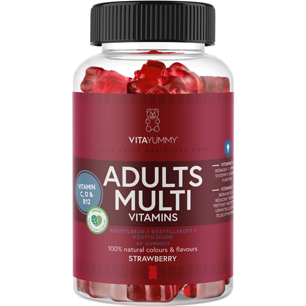 Den goda smaken kommer från jordgubbar och den vackra naturliga färgen i VitaYummy Adults Multivitamins kommer från morot och svarta vinbär.