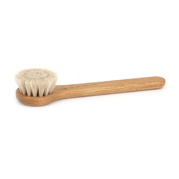 Iris Hantverks ansiktsborste i oljad ek och tagel. Borsten används våt tillsammans med din rengöringslotion för att ta bort smink, smuts och samtidigt få bort döda hudceller. Vid användning gör mjuka cirkulerande rörelser, undvik ögon och mun.