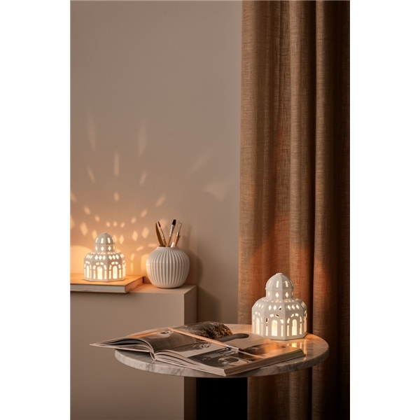Med sitt enkla och poetiska uttryck passar denna Urbania Ljuslykta Glassalen perfekt in i det moderna hemmet. Ljushusen från Kähler är tillverkade i blank glaserad keramik och är en trendig tolkning av stadsrummet med ett stilrent och exklusivt uttryck. Varje fönster är handsnidat, vilket gör alla ljushus från Urbania helt unika.Bredd: 12 cmHöjd: 14,5 cmDjup: 12 cm