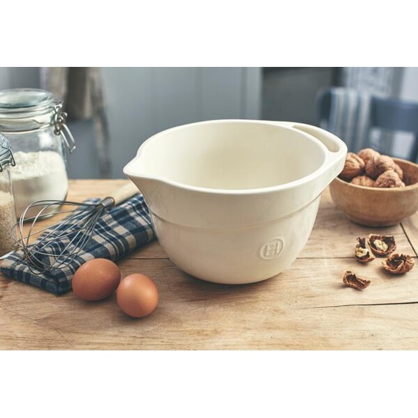 Emile Henry ́s mixskål är lätt- hanterlig, stabila och robust. Den innovativa designen på handtaget ger ett stadigt grepp vid blandning eller för att enkelt lyfta och hälla. Den stora pipen är väldigt praktiskt och fungerar även bra till tjockare deg. Dessutom är keramik ett bra material för att jämnt sprida värme på ett skonsamt sätt vilket gör att du kan använda skålen i vattenbad och vikten av skålen håller den därmed även stadig. Skålen tål mikrovågsugn och diskmaskin.