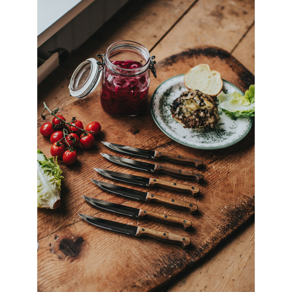 BBQ stekknivar i 6-pack levereras i trälåda och har blad i rostfritt stål samt handtag i akacia. Med sin längd ligger de stadigt i handen och skär kött med lätthet. Ett rustikt och stilfullt set som lyfter grillkvällen och ger en premiumkänsla vid varje snitt.
