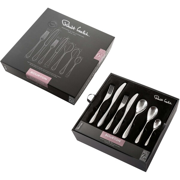 Bourton bestickserie i 42 delar från Robert Welch, inspirerad av slingrande floden som rinner genom den pittoreska byn Bourton on the Water. Med sin mjuka och eleganta profil blir bestickserien snabbt en favorit. Skedar och gafflar är tillverkade av högsta kvalitet 18/10 rostfritt stål. Knivblad är gjorda av speciellt härdat rostfritt stål för att ge bästa möjliga skäregg.