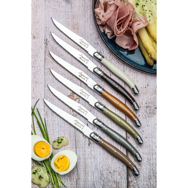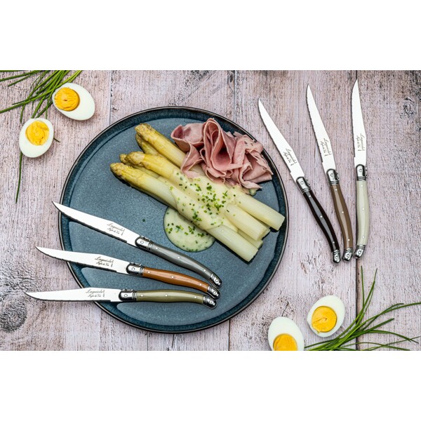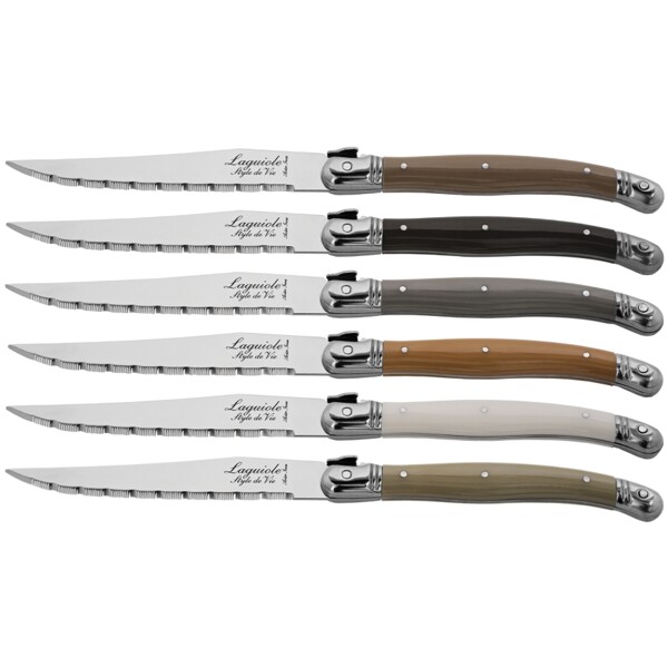 Med dessa grillknivar Treasure i set om 6 st från Premium Line of Laguiole Style de Vie skär du enkelt en god köttbit. Grillknivarnas tandade blad är gjorda av rostfritt stål. Bladet har en tjocklek på 1,8 mm och tål maskindisk. Varje set kommer i ett praktiskt träblock. Grillknivarna i Premium Line finns även i många andra färger och material.