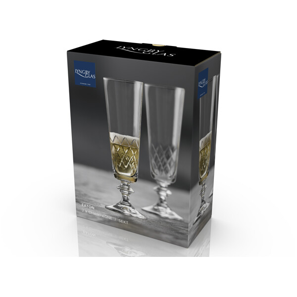 Eaton champagneglas, 16 cl, tolkar om det klassiska diamantformade mönstret från det ikoniska Eaton-glaset, som Lyngby Glas skapade på 1960-talet. Designets tidlösa estetik förenar klassisk charm med modern stil och tillför en helt unik stämning vid bordet. Tillverkat i kristallglas erbjuder Eaton enastående klarhet och hållbarhet, vilket gör glaset till ett nöje att använda – oavsett om det är för en mysig vardagsmiddag eller en festlig kväll med vänner. Glasets korta stjälk ger extra stabilitet och gör det bekvämt att hålla i. Eaton tillverkas i Europa med stor precision genom en avancerad produktionsprocess som inkluderar maskinslipning och polering. Resultatet är hög klarhet och en exklusiv finish som framhäver glasets enkla elegans.