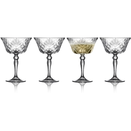 Champagneskålen framhäver på ett vackert sätt det mousserande innehållet när glasets eleganta mönster reflekterar ljus och skuggor i omgivningen. Den vackra glasserien är tillverkad i Europa. Glasen tillverkas i elektriska ugnar, som använder förnybar energi från solfångare, och överskottsvärmen från produktionen återanvänds någon annanstans på fabriken. Råvarorna som används håller absolut högsta kvalitet.
