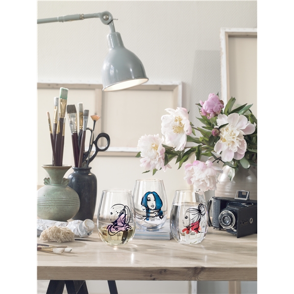 "Till den här kollektionen ville jag göra fyra tjejer som speglar bitar av min personlighet, men jag har även hämtat inspiration från modevärlden. Jag vet inte om du någonsin har varit med om att personen du älskar åker iväg? Min man reser en hel del och designerna på dessa glas föddes utifrån känslan jag har när han är borta. När personen man älskar är på andra sidan jorden och det känns som om man ska gå sönder av saknad och dagarna bara går långsammare och långsammare. Men så ses man igen och ingen känsla i världen är bättre." - Sara Woodrow, konstnärinna.