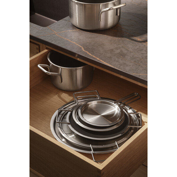 Platt grytlock från Eva Trio. Grytlocket har ett långt handtag placerat på sidan så att man inte bränner sig när man tittar till maten. Under matlagningen kan du hålla andra rätter varma på locket och stapla ovanpå. Samtliga lock passar till alla Eva Trio-grytserier och material.