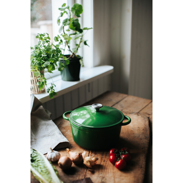 Laga fantastiskt goda grytor i denna vackra och slitstarka gjutjärnsgryta i emalj. Grytan är på fyra liter så du kan laga mat till hela din stora familj.