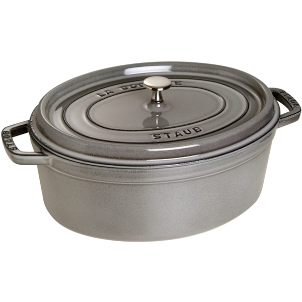 Oval gjutjärnsgryta från Staub som rymmer 6,7 liter. La Cocotte-grytan är perfekt för tillagning av bland annat stekar, raguer, gratänger, soppor och suffléer. Gjutjärnet har utmärkt värmelagring och värmefördelning när du tillagar dina rätter. Näringsämnena och aromerna bevaras bättre då och grytan bidrar därför till naturliga smakupplevelser och en vitaminrik kost. Kan användas på alla värmekällor och i ugn, även grill. Gjutjärnsgrytan är också väldigt snygg att ha framme på bordet och servera maten i.