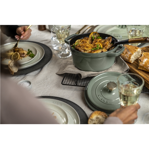 Med den runda grytan, den traditionella franska stekgrytan, lyckas du med många gryträtter och läckra stuvningar. Den har en diameter på 26 cm, en höjd på 17 cm och en volym på 5,2 l. Grytan är tillräckligt stor för att du ska kunna laga mat åt många gäster. Tack vare den attraktiva designen kan du med fördel ställa fram den på bordet vid en trevlig middag med vänner eller släktingar. Maten hålls dessutom varm längre i grytan. Den svarta grytan från Staub är tillverkad av gjutjärn. Detta robusta och långlivade material lagrar värmen extra bra och fördelar den jämnt över hela bottnen. Därigenom tillagas kött, grönsaker och andra ingredienser skonsamt och värdefulla näringsämnen bevaras. Grytan har en svart emaljbeläggning på insidan. Denna beläggning förstärker bräseringseffekten och bevarar därmed ingrediensernas naturliga smak. En sådan gryta blir dessutom bara bättre och bättre ju mer den används. Grytan från Staub passar för alla spistyper, även för induktionshällar. Den är lika omtyckt av hobbykockar som av proffs och används t.o.m. av välrenommerade stjärnkockar för nya raffinerade recept. Med den här högklassiga och samtidigt lättskötta grytan kan även du enkelt trolla fram de läckraste rätter.
