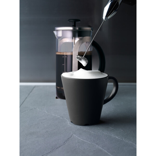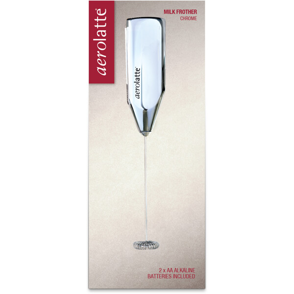 Mjölkskummare i krom. Den har en äkta metallfinish och en solid konstruktion. Mjölkskummaren har ett hållbart skaft och en slitstark motor. Visphuvudet är en originaldesign från Aerolatte och passar för att vispa både animalisk och vegetabilisk mjölk. Mjölkskummaren skapar rik och krämigt skummad mjölk på bara 20 sekunder.