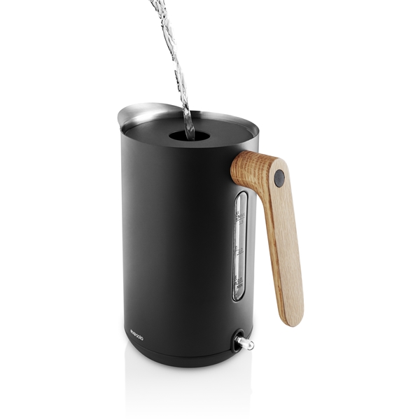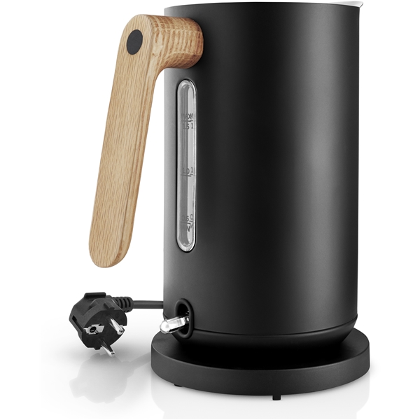 Nordic Kitchen Vattenkokare i svart med maskulint uttryck som mjukas upp på ett elegant sätt av handtaget i oljad ek. Vattenkokaren från Eva Solo är sladdlös, kan vridas i 360 grader och har en droppfri hällpip. Lätt att fylla på med vatten direkt genom locket som inte ska tas bort varken vid påfyllnad eller när man häller från den vid servering. Nordic Kitchen-vattenkokaren har en lättläslig vattenmätare samt ett dolt värmeelement, kalciumfilter och automatisk avstängning när vattnet kokar. Tål inte maskindisk. Underhåll handtaget med regelbunden oljning.