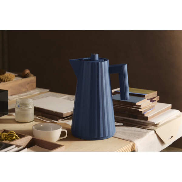Plissé elektrisk vattenkokare från Alessi med design av Michele Delucchi. Vattenkokarens form definieras av dess veck, en teknik som är ganska gammal men används fortfarande väldigt mycket idag. Med den skickliga och kreativa användningen av plätering utformar modeformgivare tyger och skapar kläder som blir som skulpturella konstverk. "Plissé" formades utgående från ett veckat papper, som sedan utvecklats och producerades av Alessi som om det vore ett vackert skräddarsytt föremål. Vecken skapar formen, strukturerar den, eftersom en form utan veck endast är en volym utan form. Vecken förvandlar enkla tvådimensionella ark till tredimensionella föremål. En klassiker med modern design. Finns i flera färger.