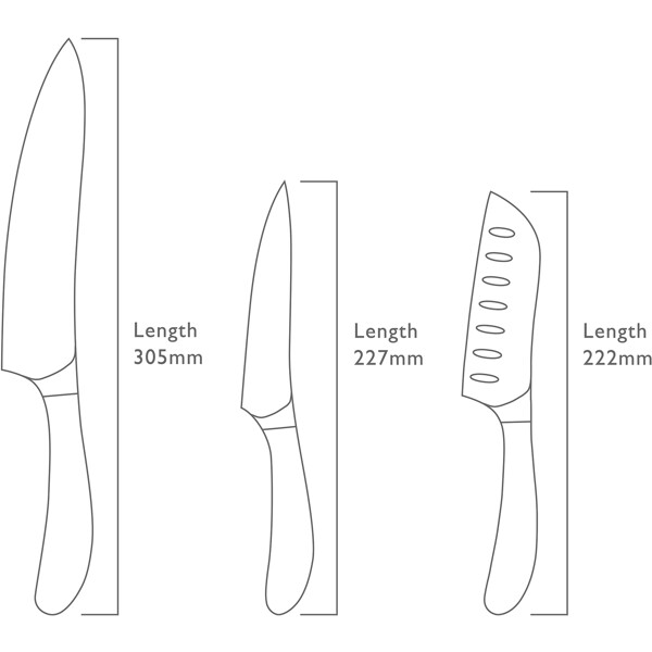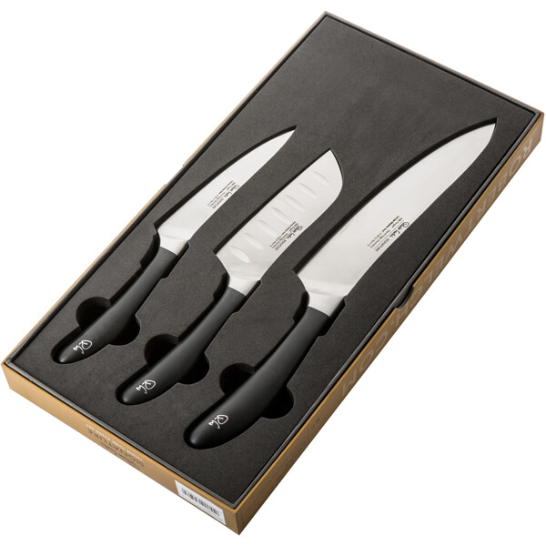 Robert Welch Signature Hemmakocken 3del knivset som innehåller en 11 cm Santokukniv, en 12 cm Allkniv och en 18 cm Kockkniv.