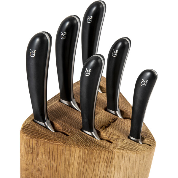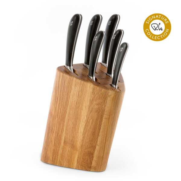 Förvara dina köksknivar med stil i Robert Welch Signature Prism knivblock, tillverkat i massiv ek och utformat för både funktion och elegans. Knivblocket har en lätt lutande men stabil konstruktion med silikonfötter, vilket skyddar arbetsytan och ger perfekt stabilitet. De generösa slotsen håller knivarna lättillgängliga samtidigt som bladen skyddas.