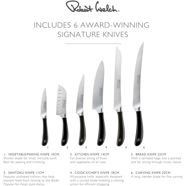 Samtliga knivar är tillverkade av specialhärdat rostfritt stål och omfattas av Robert Welchs livstidsgaranti.