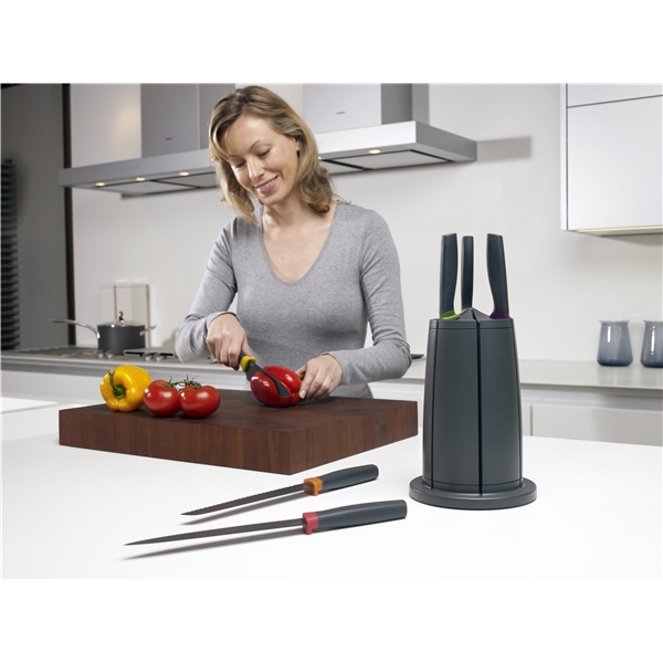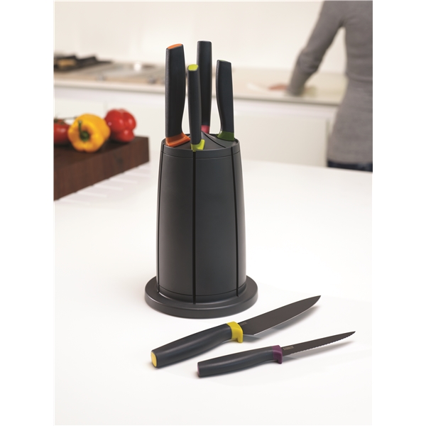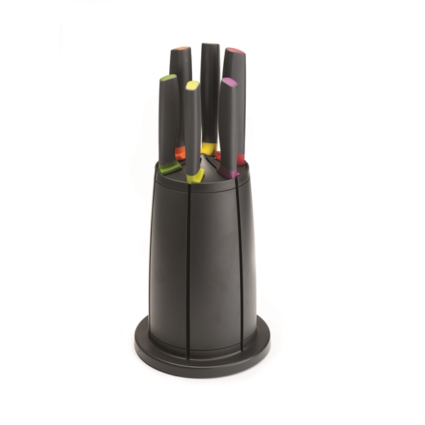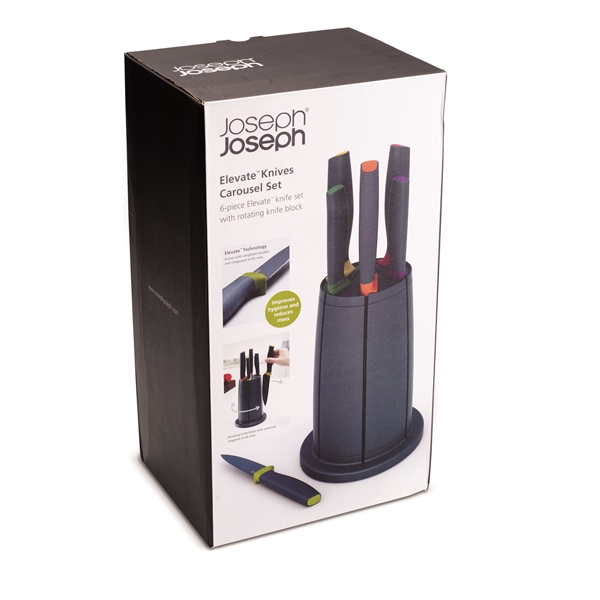 Roterande knivställ inkl knivar.Detta köksredskap har utformats särskilt för att förbättra hygienen och minimera röran genom att placera redskap på köksytor under användning. Varje verktyg har ett innovativ vägt handtag, när redskapet placeras nedåt är huvudet alltid höjt bort från arbetsytan.Dessa nya Elevate knivar är alla tillverkade av högkvalitativt rostfritt stål och har non-stick, silikonbelagda blad och bekväma, ergonomiska handtag. Sex knivar inkl ett elegant roterande knivblock. Elevate roterande knivblock är extremt robust med en halkfri bas och universella, magnetiska knivar som sitter säkert på plats vid förvaring. Denna innovativa design innebär att alla Elevate ™ knivar kan lagras oavsett bladlängd. Detta Elevate knivställ omfattar: