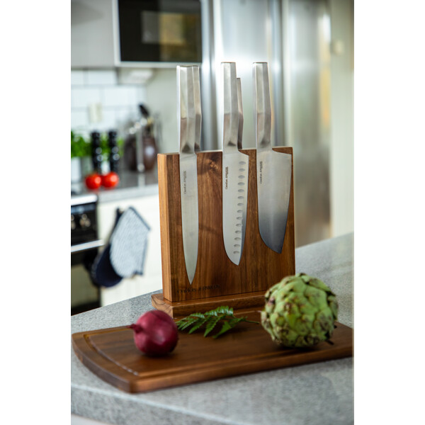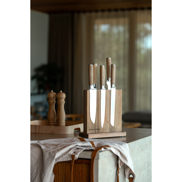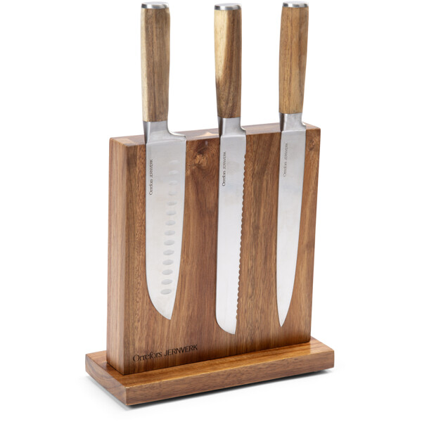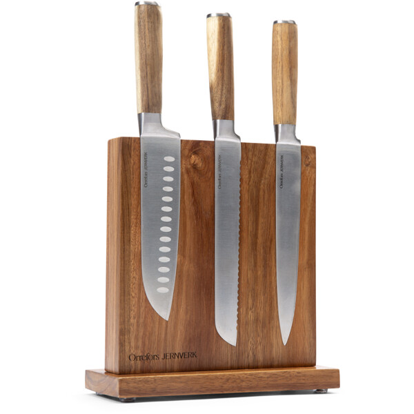 Smart, elegant och praktiskt knivställ tillverkat i hållbar akacia. Stället har två inbyggda magneter som håller köksknivarna smidigt på plats - på båda sidor. Genom att använda ett knivställ håller du knivarna vassa och skarpa längre och har dem dessutom alltid nära till hands när du lagar mat.