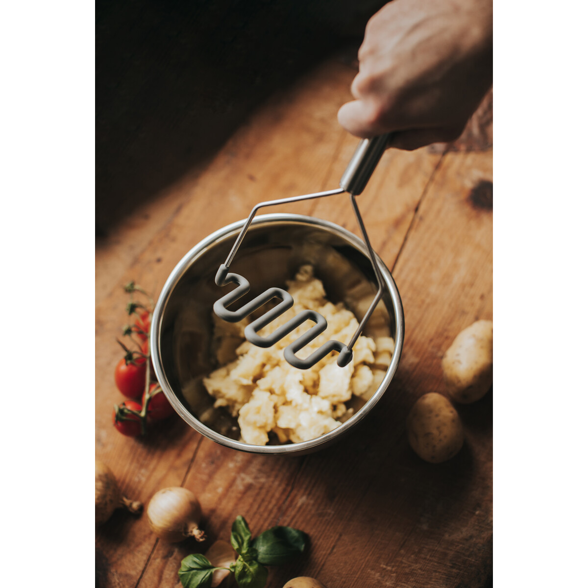 Pam potatisstomp i rostfritt stål och silikon ger ett stadigt grepp och jämn pressning. Den breda stompyta gör det enkelt att få fluffigt mos och fin textur. En hållbar och lättanvänd köksdetalj som förenklar vardagsmatlagningen och fungerar lika bra till rotfrukter som potatis.